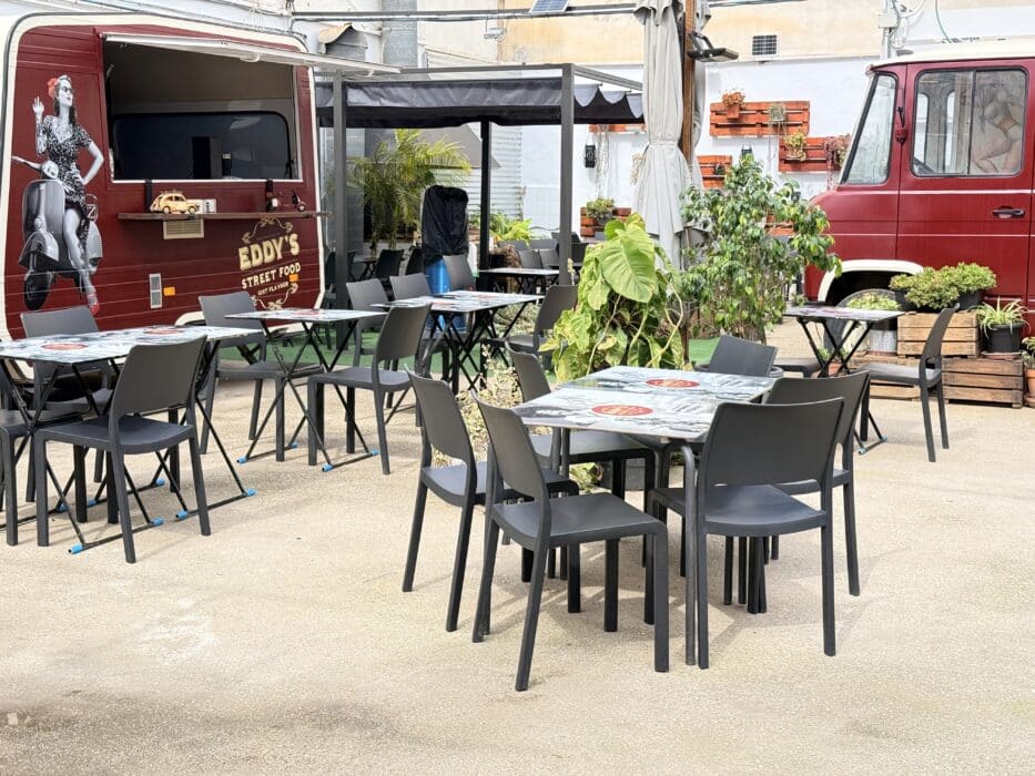 Imagina relajarte al aire libre rodeado de vegetación fresca, sentado en sofás con historia, junto a dos auténticos food trucks vintage. Un ambiente sin tensiones donde nadie tiene prisa por irse.
